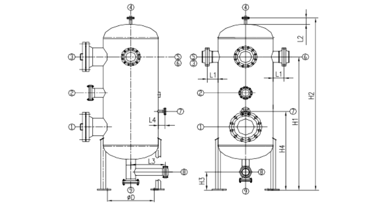 旋風分離器為水平安裝和立式安裝。水平安裝時設備的主軸線水平度小于5/1000,垂直安裝時設備的主軸線不垂直度小于3/1000。設備采用法蘭連接,并配置放空閥、安全閥、壓力表及排污閥等。