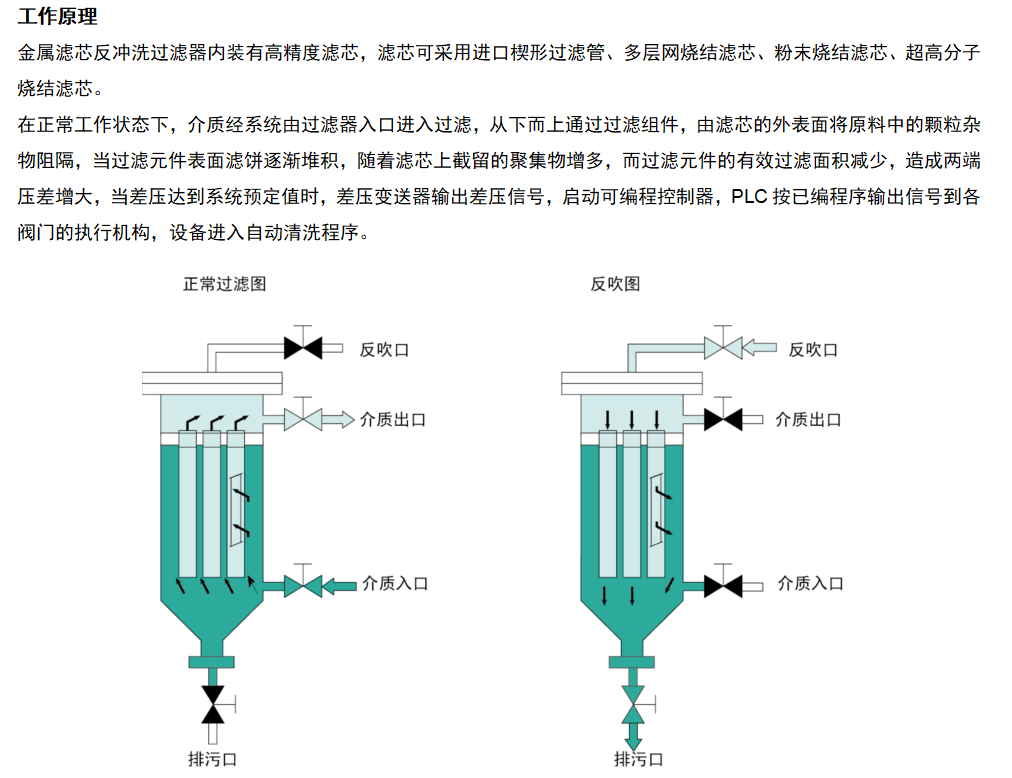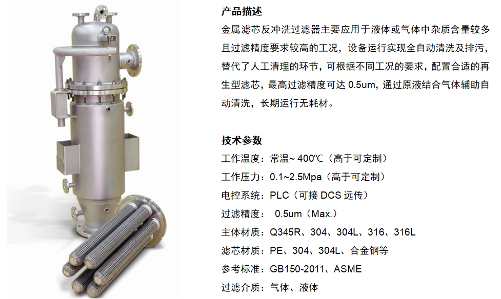 金屬濾芯反沖洗過濾器主要應(yīng)用于液體或氣體中雜質(zhì)含量較多且過濾精度要求較高的工況,設(shè)備運(yùn)行實(shí)現(xiàn)全自動清洗及排污,替代了人工清理的環(huán)節(jié),可根據(jù)不同工況的要求,配置合適的再生型濾芯,最高過濾精度可達(dá)0.5um,通過原液結(jié)合氣體輔助自動清洗,長期運(yùn)行無耗材。